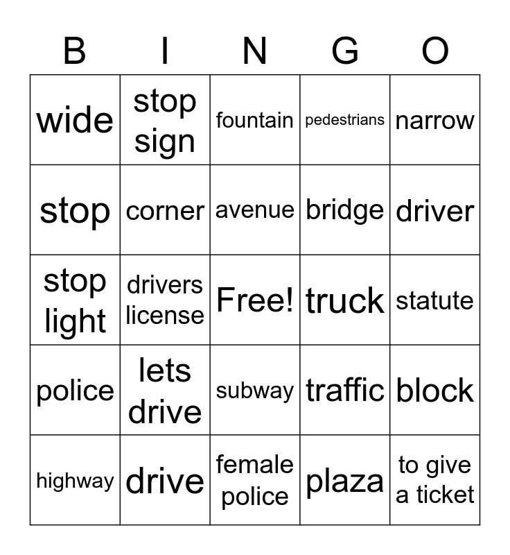 This bingo card has a free space and 24 words: lets drive, drive, avenue, highway, narrow, wide, stop, stop sign, truck, subway, bridge, stop light, traffic, block, corner, plaza, statute, fountain, driver, drivers license, to give a ticket, police, pedestrians and female police.