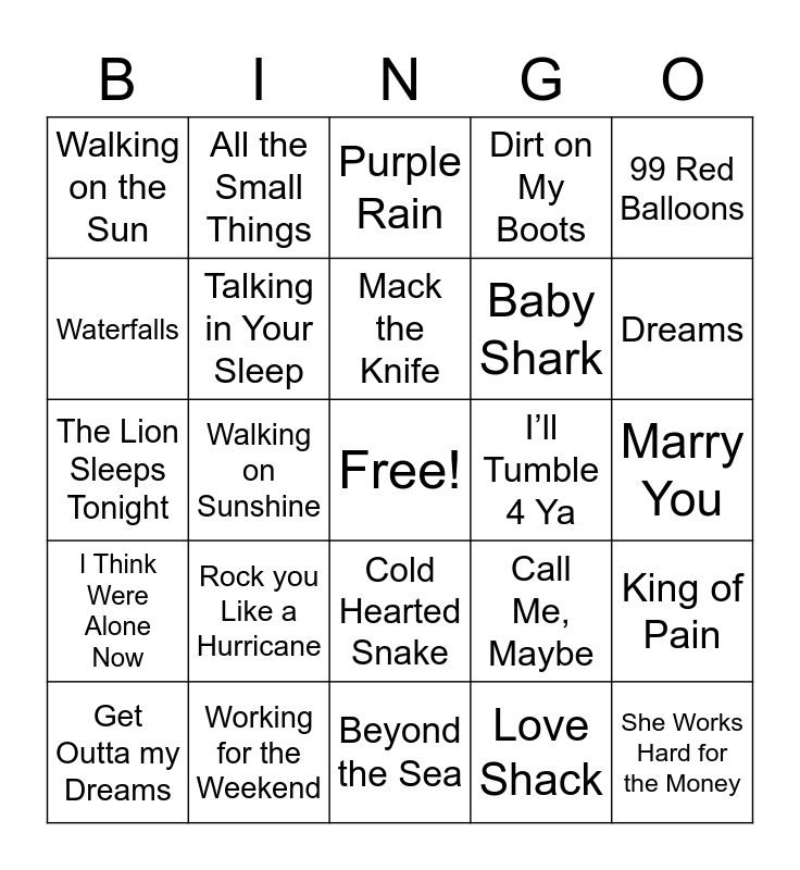 This bingo card has a free space and 63 words: Learning to Fly, Cats in the Cradle, Blank Space, King of Pain, Tears of a Clown, Happy, All the Small Things, Who Let the Dogs Out?, Mack the Knife, Horse With No Name, Cold Hearted Snake, Union of the Snake, Marry You, 99 Red Balloons, Breathe, Waterfalls, Walking on Sunshine, Walking on the Sun, Barracuda, Baby Shark, Rock you Like a Hurricane, I Think Were Alone Now, Dirt on My Boots, Changes, You Shook Me All Night Long, Night Shift, Sunglasses at Night, December 1963 (Oh What a Night), Southern Nights, All Night Long, Wild Nights, Ladies Night, Nighttime is the Right Time, Twisting the Night Away, Dreams, Get Outta my Dreams, Set Fire to the Rain, Love Shack, Love Rollercoaster, Talking in Your Sleep, The Lion Sleeps Tonight, I’ll Tumble 4 Ya, Drive (Incubus), Drive (The Cars), She Works Hard for the Money, Working for the Weekend, Call Me, Call Me, Maybe, Mr. Telephone Man, Telephone, Sea of Love, Beyond the Sea, Get Up Stand Up, Stand By Me, Stand, Purple Rain, Dancing in the Dark, Sweet Home Alabama, Dancing Queen, Touch of Grey, Old Time Rock N Roll, Ride Like the Wind and Dust in the Wind.
