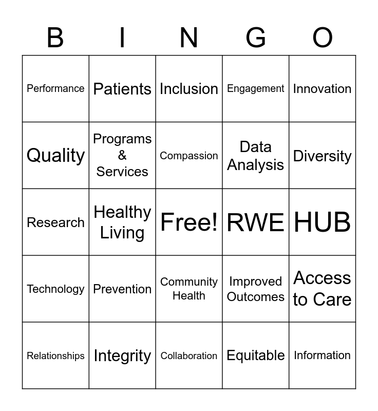 This bingo card has a free space and 24 words: Prevention, Integrity, Compassion, Relationships, Innovation, Performance, Quality, Patients, RWE, Community Health, Data Analysis, Research, Improved Outcomes, Access to Care, Programs & Services, Equitable, HUB, Inclusion, Diversity, Healthy Living, Information, Technology, Engagement and Collaboration.