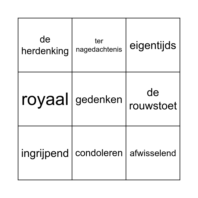 This bingo card has 23 words: begraven, de ceremonie, condoleren, de crematie, gedenken, de herdenking, de rouwstoet, ter nagedachtenis, de uitvaart, de weduwe, de weduwnaar, afwisselend, behoorlijk, het comfort, compact, eigenaardig, eigentijds, heldhaftig, ingrijpend, monotoon, royaal, de variant and volstrekt.