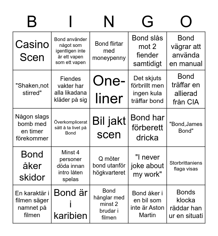 This bingo card has 25 words: Minst 4 personer döda innan intro låten spelas, Bond hånglar med minst 2 brudar i filmen, One-liner, En karaktär i filmen säger namnet på filmen, Bond vägrar att använda en manual, Casino Scen, "Shaken,not stirred", Bond använder något som igentligen inte är ett vapen som ett vapen, Bond har förberett dricka, Q möter bond utanför högkvarteret, Det skjuts förbrillt men ingen kula träffar bond, Någon slags bomb med en timer förekommer, "I never joke about my work", Storbrittaniens flaga visas, Fiendes vakter har alla likadana kläder på sig, Bonds klocka räddar han ur en situati, "Bond,James Bond", Bond flirtar med moneypenny, Bond träffar en allierad från CIA, Överkomplicerat sätt å ta livet på Bond, Bil jakt scen, Bond är i karibien, Bond åker skidor, Bond slås mot 2 fiender samtidigt and Bond åker i en bil som inte är Aston Martin.