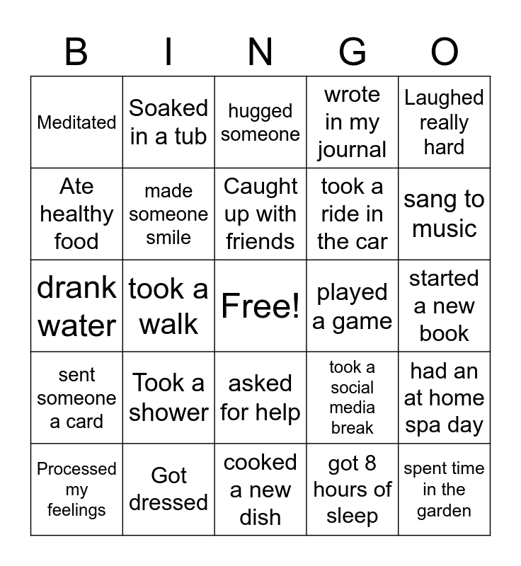 This bingo card has a free space and 24 words: Took a shower, Got dressed, Caught up with friends, Processed my feelings, Laughed really hard, Meditated, Ate healthy food, Soaked in a tub, played a game, asked for help, took a ride in the car, drank water, took a social media break, had an at home spa day, made someone smile, got 8 hours of sleep, started a new book, hugged someone, sang to music, took a walk, spent time in the garden, sent someone a card, wrote in my journal and cooked a new dish.