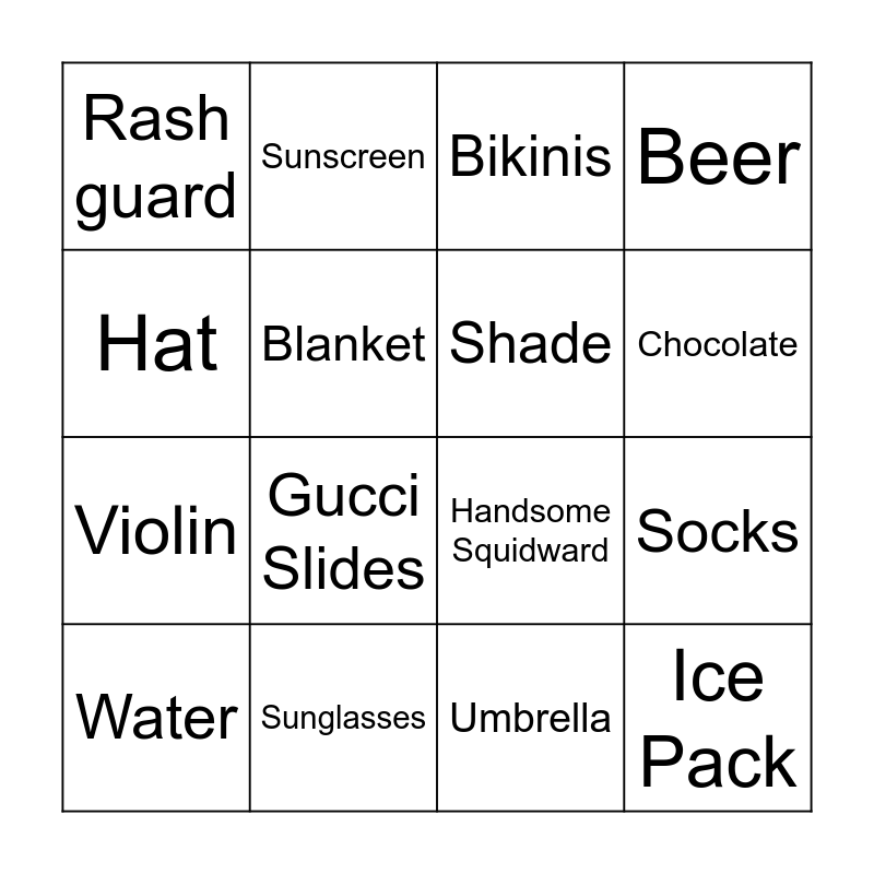 This bingo card has 16 words: Sunglasses, Socks, Bikinis, Rash guard, Violin, Sunscreen, Handsome Squidward, Umbrella, Hat, Blanket, Water, Beer, Gucci Slides, Chocolate, Shade and Ice Pack.