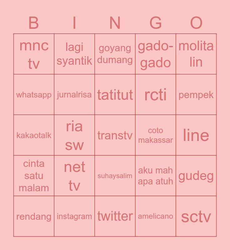 This bingo card has 25 words: net tv, twitter, tatitut, rendang, molita lin, mnc tv, whatsapp, lagi syantik, coto makassar, suhaysalim, rcti, kakaotalk, aku mah apa atuh, gudeg, jurnalrisa, sctv, line, goyang dumang, pempek, ria sw, transtv, instagram, cinta satu malam, gado-gado and amelicano.