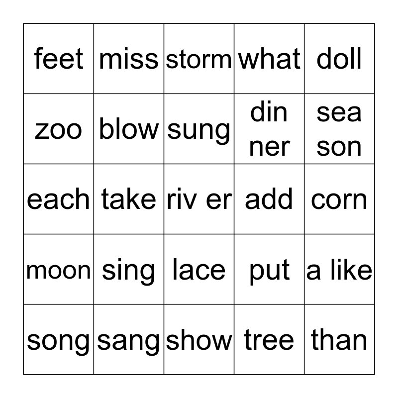 This bingo card has a free space and 24 words: sing, sang, sung, song, doll, feet, zoo, miss, add, lace, din ner, each, put, a like, blow, tree, corn, storm, sea son, take, than, moon, what and show.