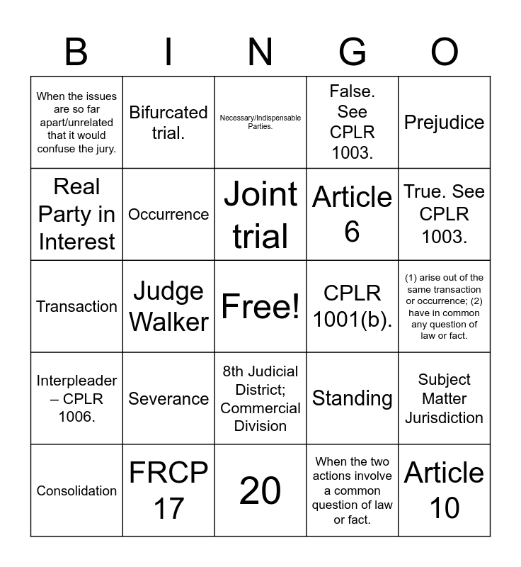 This bingo card has a free space and 24 words: Consolidation, Severance, Joint trial, When the two actions involve a common question of law or fact., Prejudice, When the issues are so far apart/unrelated that it would confuse the jury., Bifurcated trial., Necessary/Indispensable Parties., CPLR 1001(b)., (1) arise out of the same transaction or occurrence; (2) have in common any question of law or fact., Transaction, Occurrence, Standing, Subject Matter Jurisdiction, Real Party in Interest, FRCP 17, 20, False. See CPLR 1003., True. See CPLR 1003., Interpleader – CPLR 1006., Judge Walker, 8th Judicial District; Commercial Division, Article 6 and Article 10.
