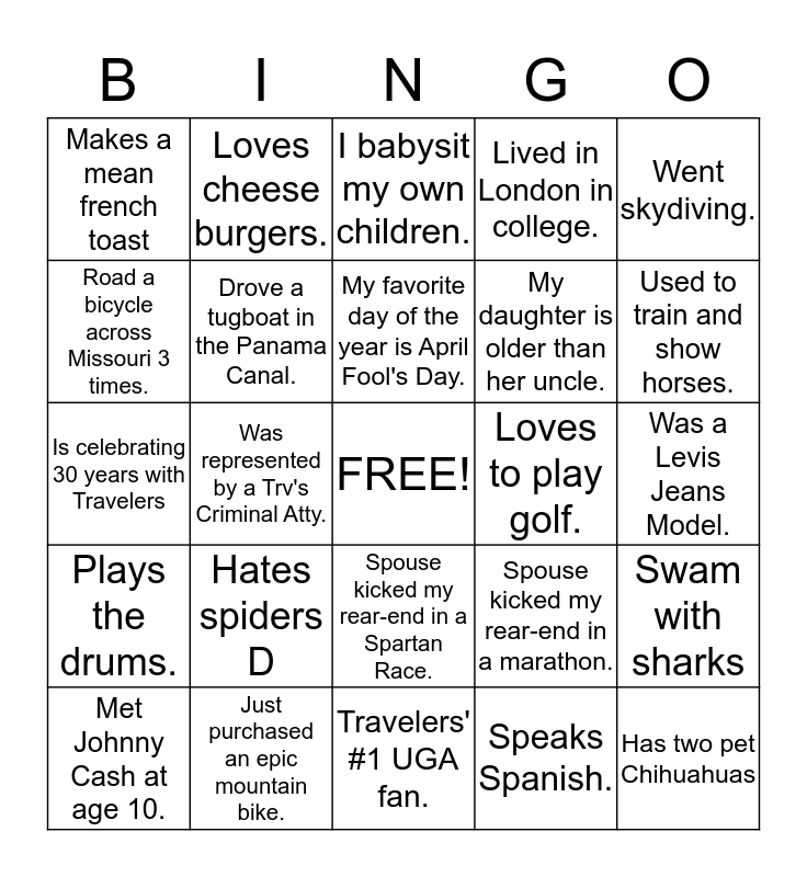 This bingo card has a free space and 24 words: Hates spiders D, Just purchased an epic mountain bike., My favorite day of the year is April Fool's Day., Met Johnny Cash at age 10., Went skydiving., Makes a mean french toast, Road a bicycle across Missouri 3 times., Loves cheese burgers., Loves to play golf., Spouse kicked my rear-end in a Spartan Race., My daughter is older than her uncle., Is celebrating 30 years with Travelers, Spouse kicked my rear-end in a marathon., Swam with sharks, Drove a tugboat in the Panama Canal., Speaks Spanish., Was a Levis Jeans Model., I babysit my own children., Used to train and show horses., Was represented by a Trv's Criminal Atty., Has two pet Chihuahuas, Plays the drums., Lived in London in college. and Travelers' #1 UGA fan..