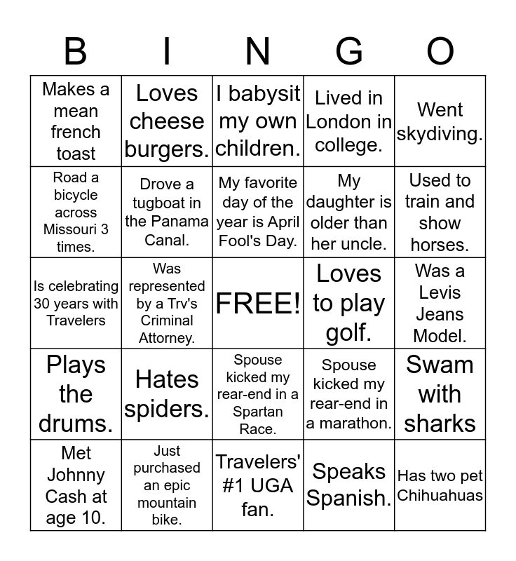 This bingo card has a free space and 24 words: Hates spiders., Just purchased an epic mountain bike., My favorite day of the year is April Fool's Day., Met Johnny Cash at age 10., Went skydiving., Makes a mean french toast, Road a bicycle across Missouri 3 times., Loves cheese burgers., Loves to play golf., Spouse kicked my rear-end in a Spartan Race., My daughter is older than her uncle., Is celebrating 30 years with Travelers, Spouse kicked my rear-end in a marathon., Swam with sharks, Drove a tugboat in the Panama Canal., Speaks Spanish., Was a Levis Jeans Model., I babysit my own children., Used to train and show horses., Was represented by a Trv's Criminal Attorney., Has two pet Chihuahuas, Plays the drums., Lived in London in college. and Travelers' #1 UGA fan..