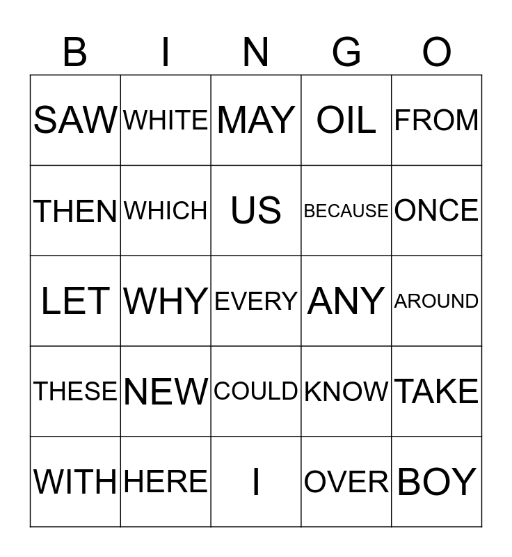 This bingo card has 25 words: NEW, I, US, WITH, FROM, SAW, THEN, WHITE, ANY, COULD, BECAUSE, LET, KNOW, TAKE, WHICH, BOY, AROUND, MAY, ONCE, WHY, EVERY, HERE, THESE, OIL and OVER.