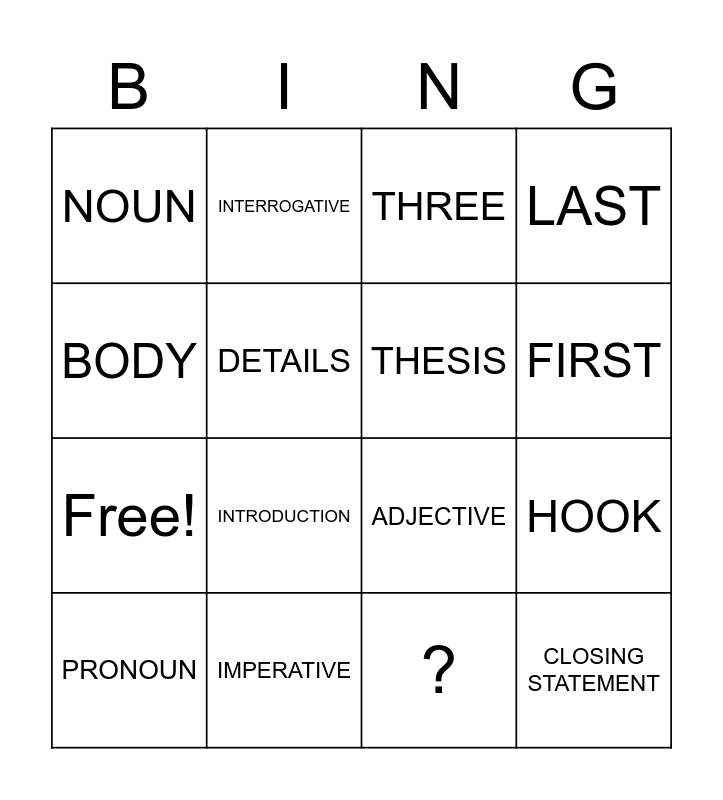 This bingo card has 20 words: HOOK, EXCLAMATORY, THREE, CONCLUSION, PRONOUN, BODY, IMPERATIVE, NOUN, Free!, INTERROGATIVE, INTRODUCTION, ADJECTIVE, DETAILS, CLOSING STATEMENT, THESIS, DECLARATIVE, FIRST, LAST, ? and !.