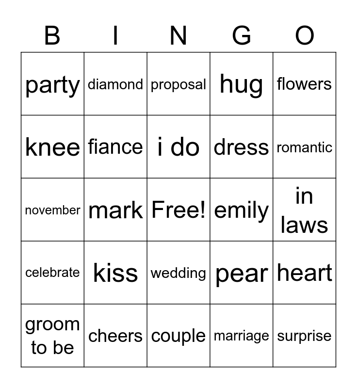 This bingo card has a free space and 38 words: catholic, love, dating, fiance, heart, kiss, i do, jewelry, flowers, dress, mark, hug, surprise, in laws, knee, celebrate, love birds, proposal, impatience, emily, party, cheers, romantic, groom to be, patience, couple, fun, engagement, church, bride to be, congrats, wedding, marriage, diamond, ring, pear, november and florida.