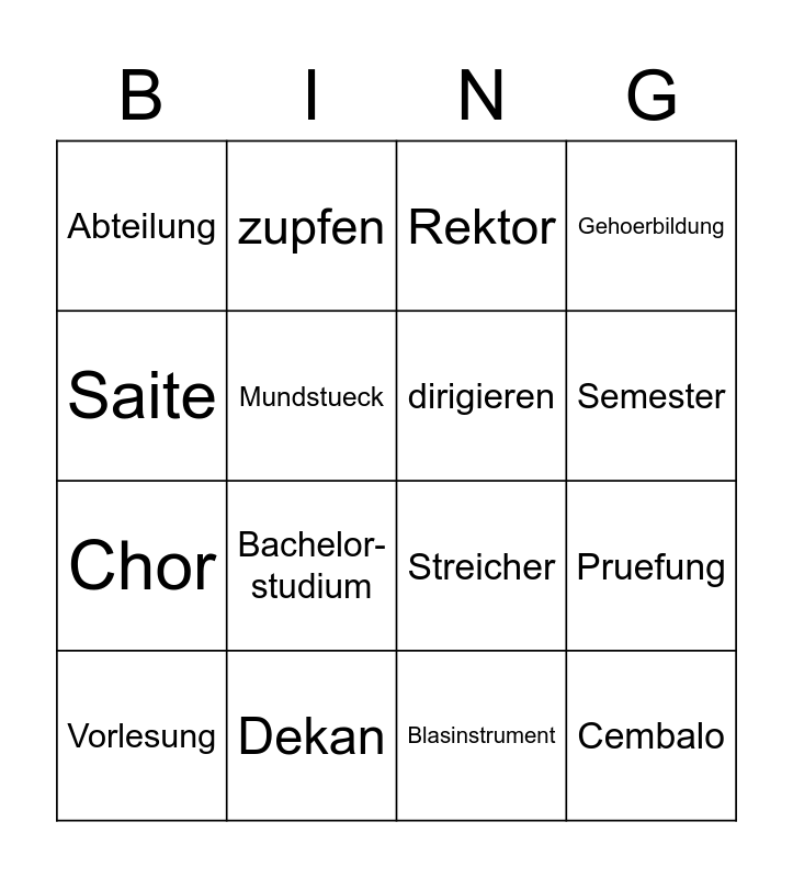 This bingo card has 16 words: Dekan, Pruefung, Rektor, Abteilung, Chor, zupfen, Streicher, Blasinstrument, Saite, Mundstueck, Vorlesung, Gehoerbildung, Bachelor-studium, Semester, dirigieren and Cembalo.
