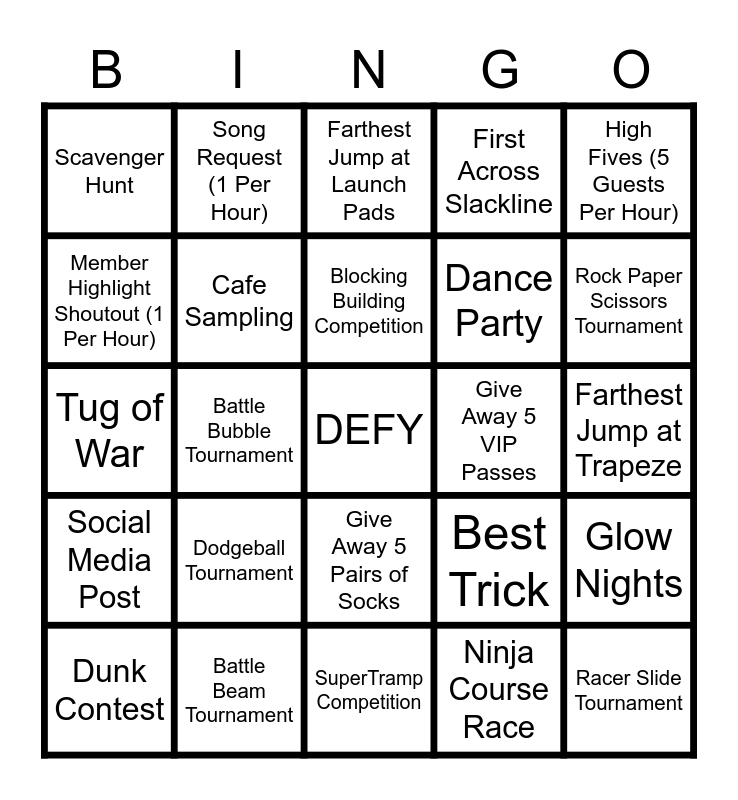 This bingo card has a free space and 24 words: Dodgeball Tournament, Battle Beam Tournament, Blocking Building Competition, Dunk Contest, High Fives (5 Guests Per Hour), Scavenger Hunt, Member Highlight Shoutout (1 Per Hour), Song Request (1 Per Hour), Give Away 5 VIP Passes, Give Away 5 Pairs of Socks, Dance Party, Tug of War, Best Trick, Glow Nights, Cafe Sampling, Ninja Course Race, Farthest Jump at Trapeze, Farthest Jump at Launch Pads, Rock Paper Scissors Tournament, Battle Bubble Tournament, Racer Slide Tournament, Social Media Post, First Across Slackline and SuperTramp Competition.