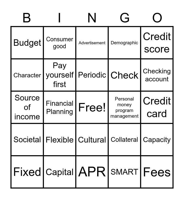 This bingo card has a free space and 24 words: Fixed, Flexible, Periodic, SMART, Credit score, Budget, Consumer good, Advertisement, Personal money program management, Credit card, Source of income, Pay yourself first, Collateral, Capacity, Character, Capital, APR, Demographic, Checking account, Societal, Financial Planning, Cultural, Check and Fees.