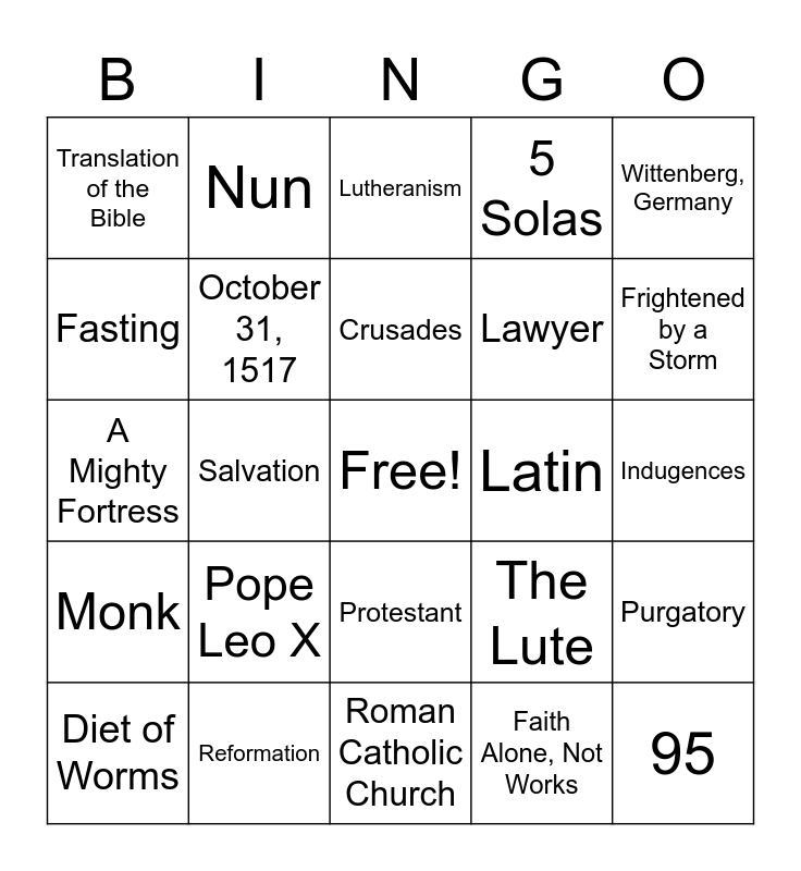 This bingo card has a free space and 24 words: Pope Leo X, Reformation, Crusades, Diet of Worms, Wittenberg, Germany, Translation of the Bible, Fasting, Nun, Latin, Protestant, Lawyer, A Mighty Fortress, The Lute, Purgatory, October 31, 1517, Faith Alone, Not Works, Indugences, Lutheranism, Frightened by a Storm, Salvation, 95, Monk, 5 Solas and Roman Catholic Church.