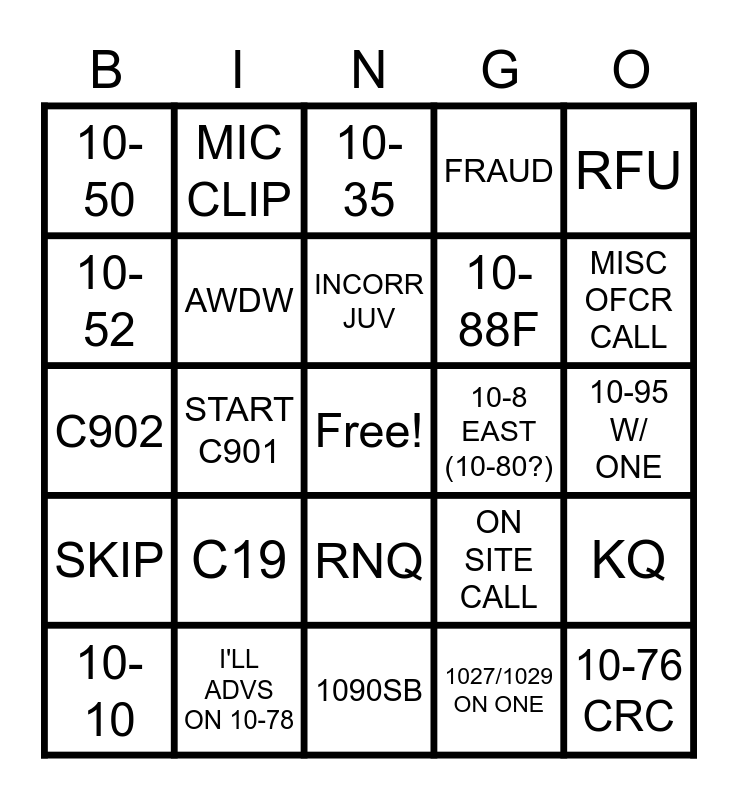 This bingo card has a free space and 24 words: C19, I'LL ADVS ON 10-78, INCORR JUV, 10-10, RFU, 10-50, 10-52, MIC CLIP, 10-8 EAST (10-80?), RNQ, 10-88F, C902, ON SITE CALL, KQ, AWDW, 1027/1029 ON ONE, 10-95 W/ ONE, 10-35, MISC OFCR CALL, START C901, 10-76 CRC, SKIP, FRAUD and 1090SB.