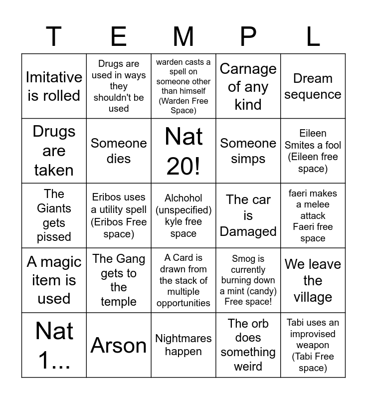 This bingo card has 25 words: The Gang gets to the temple, Nightmares happen, Nat 20!, Nat 1..., Dream sequence, Imitative is rolled, Drugs are taken, Drugs are used in ways they shouldn't be used, The car is Damaged, A Card is drawn from the stack of multiple opportunities, Someone simps, The Giants gets pissed, Smog is currently burning down a mint (candy) Free space!, We leave the village, Someone dies, Tabi uses an improvised weapon (Tabi Free space), faeri makes a melee attack Faeri free space, warden casts a spell on someone other than himself (Warden Free Space), Eileen Smites a fool (Eileen free space), Eribos uses a utility spell (Eribos Free space), Alchohol (unspecified) kyle free space, Arson, A magic item is used, Carnage of any kind and The orb does something weird.