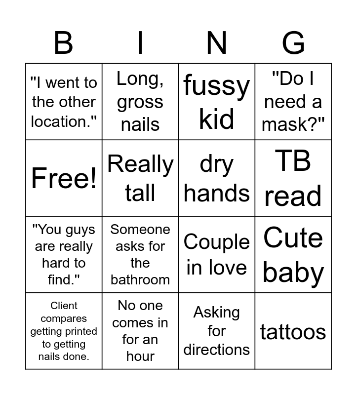 This bingo card has 16 words: No one comes in for an hour, Cute baby, fussy kid, ''I went to the other location.'', ''You guys are really hard to find.'', Long, gross nails, Couple in love, Asking for directions, Free!, Really tall, Client compares getting printed to getting nails done., ''Do I need a mask?'', Someone asks for the bathroom, TB read, dry hands and tattoos.