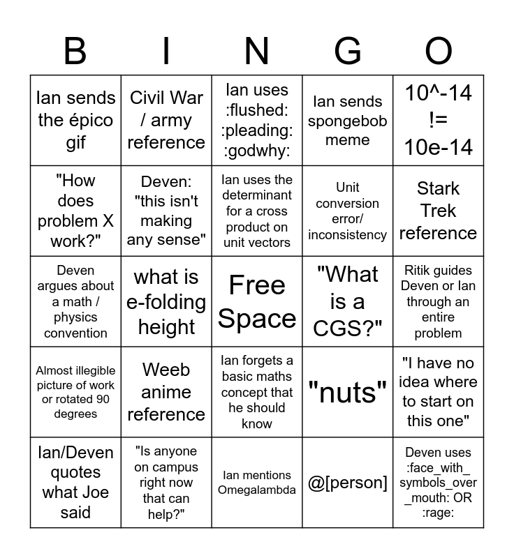 This bingo card has a free space and 24 words: Weeb anime reference, "Is anyone on campus right now that can help?", Ian uses the determinant for a cross product on unit vectors, Ian/Deven quotes what Joe said, 10^-14 != 10e-14, Ian sends the épico gif, "How does problem X work?", Civil War / army reference, "What is a CGS?", Ian forgets a basic maths concept that he should know, Unit conversion error/ inconsistency, Deven argues about a math / physics convention, "nuts", "I have no idea where to start on this one", Deven: "this isn't making any sense", @[person], Ritik guides Deven or Ian through an entire problem, Ian uses :flushed: :pleading: :godwhy:, Stark Trek reference, what is e-folding height, Deven uses :face_with_ symbols_over _mouth: OR :rage:, Almost illegible picture of work or rotated 90 degrees, Ian sends spongebob meme and Ian mentions Omegalambda.