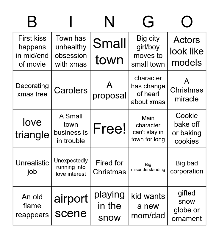 This bingo card has a free space and 29 words: An old flame reappears, Hot Cocoa, A Small town business is in trouble, Main Character lost a parent, First kiss happens in mid/end of movie, Small town, Carolers, Unexpectedly running into love interest, Main character can't stay in town for long, airport scene, Cookie bake off or baking cookies, gifted snow globe or ornament, playing in the snow, kid wants a new mom/dad, A Christmas miracle, mistletoe (kiss), Fired for Christmas, Unrealistic job, Actors look like models, love triangle, Big misunderstanding, Breakup scene, character has change of heart about xmas, Decorating xmas tree, Big city girl/boy moves to small town, Town has unhealthy obsession with xmas, Big bad corporation, A proposal and Bad/cheesy xmas puns.