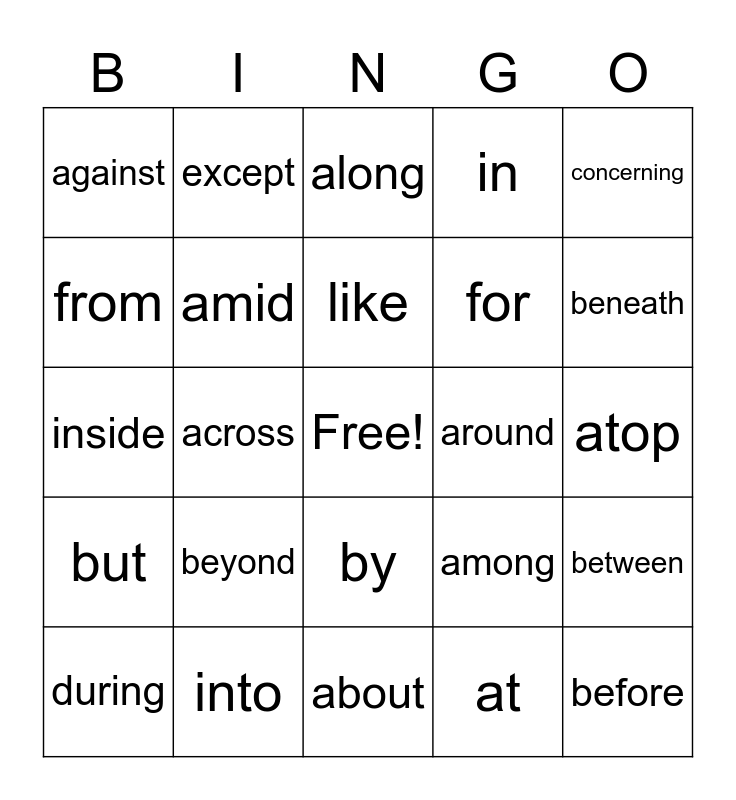 This bingo card has a free space and 31 words: about, above, across, after, against, along, amid, among, around, at, atop, before, behind, below, beneath, beside, between, beyond, but, by, concerning, down, during, except, for, from, in, inside, into, like and near.