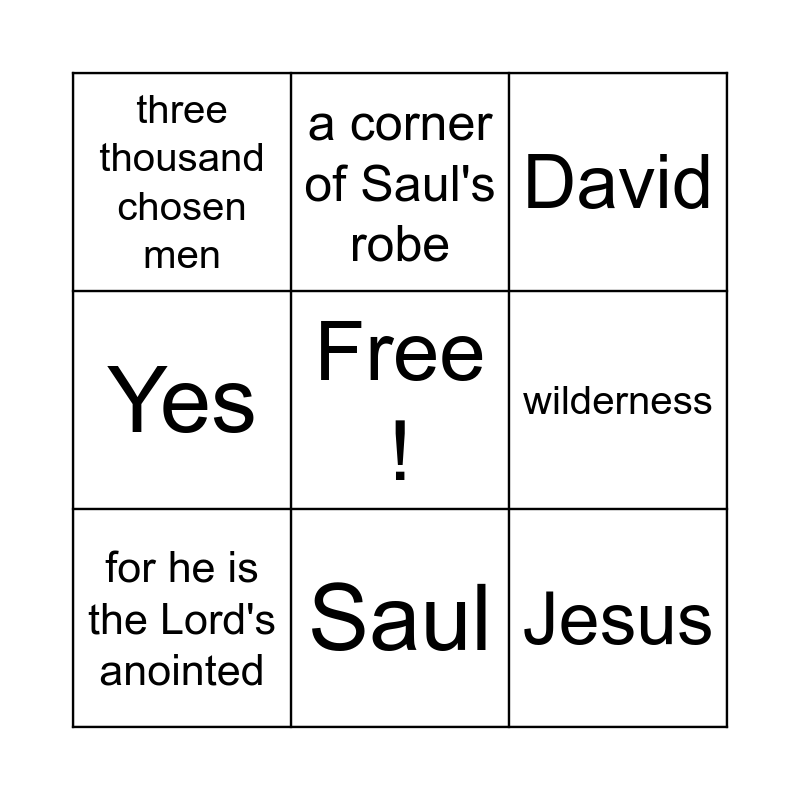 This bingo card has a free space and 8 words: wilderness, David, a corner of Saul's robe, for he is the Lord's anointed, three thousand chosen men, Jesus, Yes and Saul.