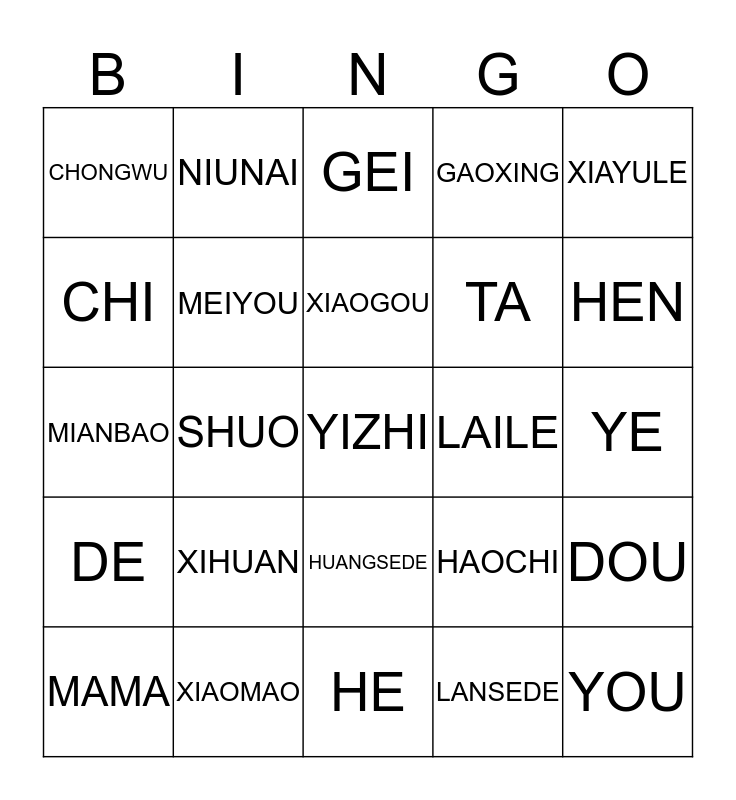 This bingo card has 25 words: XIHUAN, HE, XIAOGOU, MAMA, XIAYULE, CHONGWU, CHI, NIUNAI, LAILE, HUANGSEDE, TA, MIANBAO, HAOCHI, DOU, MEIYOU, YOU, YE, GEI, HEN, SHUO, YIZHI, XIAOMAO, DE, GAOXING and LANSEDE.
