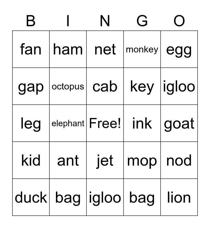 This bingo card has a free space and 24 words: ant, bag, cab, duck, egg, fan, gap, ham, ink, jet, key, leg, mop, nod, octopus, bag, goat, net, igloo, elephant, lion, kid, monkey and igloo.