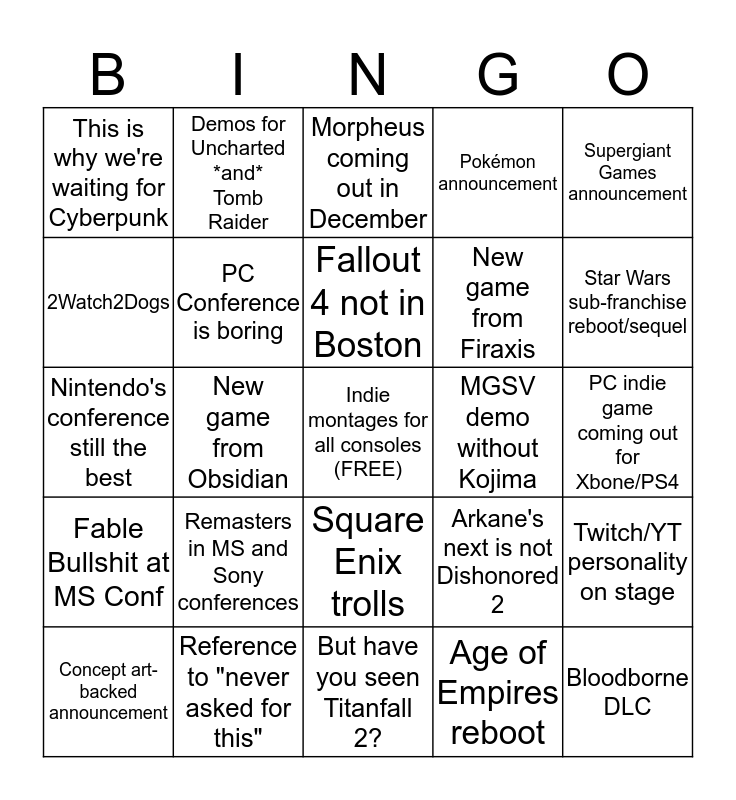 This bingo card has a free space and 27 words: Arkane's next is not Dishonored 2, Phil Spencer changes his T-Shirt, New game from Firaxis, But have you seen Titanfall 2?, 2Watch2Dogs, Morpheus coming out in December, Demos for Uncharted *and* Tomb Raider, Fable Bullshit at MS Conf, MGSV demo without Kojima, Twitch/YT personality on stage, Nintendo's conference still the best, Pokémon announcement, Concept art-backed announcement, Reference to "never asked for this", Star Wars sub-franchise reboot/sequel, 4+ game announcements at Bethesda, PC Conference is boring, Fallout 4 not in Boston, Remasters in MS and Sony conferences, This is why we're waiting for Cyberpunk, PC indie game coming out for Xbone/PS4, Age of Empires reboot, New game from Obsidian, Bloodborne DLC, Square Enix trolls, Supergiant Games announcement and Ubisoft's conference still the worst.