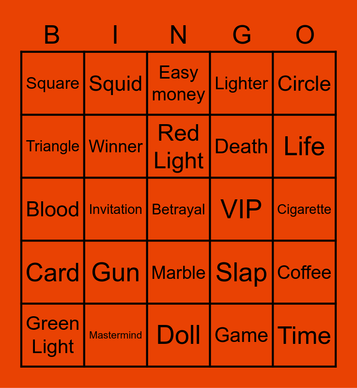 This bingo card has 25 words: Gun, Doll, Red Light, Green Light, Circle, Square, Triangle, Squid, VIP, Marble, Death, Blood, Slap, Coffee, Winner, Time, Cigarette, Easy money, Life, Invitation, Betrayal, Mastermind, Card, Lighter and Game.
