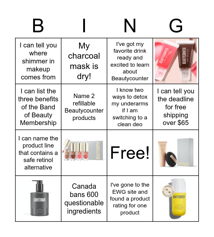 This bingo card has 5 images and 17 words: Canada bans 600 questionable ingredients, I understand the dangers of talc, My charcoal mask is dry!, I can tell you approx how many chemicals are in commerce today, Name 2 refillable Beautycounter products, I know two ways to detox my underarms if I am switching to a clean deo, I can tell you where shimmer in makeup comes from, I've got my favorite drink ready and excited to learn about Beautycounter, Free!, I can name the product line that contains a safe retinol alternative, I can name one item on Beautycounter's never list, I can name two uses for the Lotus balm, I've gone to the EWG site and found a product rating for one product, 30-the amount of questionable ingredients banned by the USA, I can list the three benefits of the Band of Beauty Membership, I can tell you the deadline for free shipping over $65 and True or False: Beautycounter wants to become a certified B Corp.