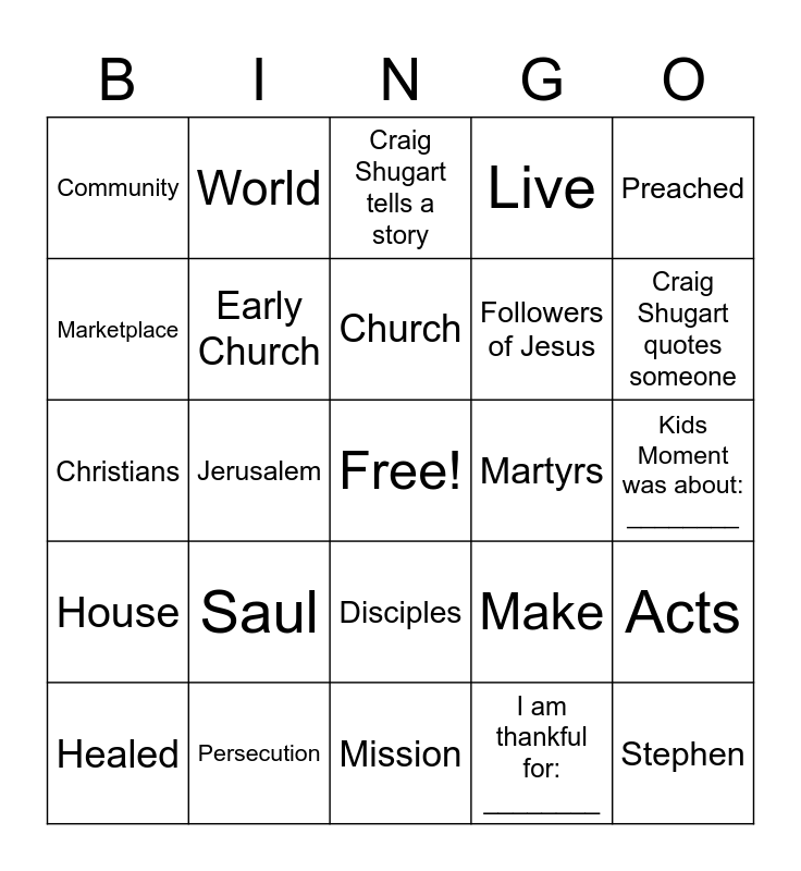 This bingo card has a free space and 24 words: Saul, Persecution, Church, Healed, Preached, Community, Marketplace, World, Martyrs, Disciples, Followers of Jesus, Christians, Make, Acts, Early Church, I am thankful for: ________, Kids Moment was about: ________, Craig Shugart tells a story, Craig Shugart quotes someone, Jerusalem, Stephen, House, Live and Mission.
