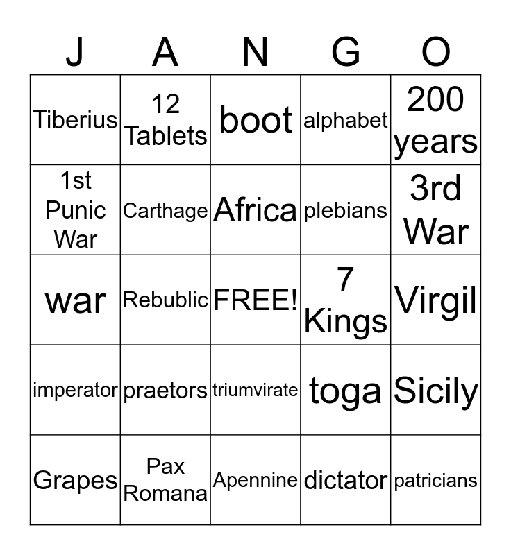 This bingo card has a free space and 47 words: peninsula, patricians, consuls, Apennine, praetors, Tiber, 12 Tablets, Greeks, 1st Punic War, Olives, Carthage, alphabet, Sicily, toga, Hannibal, sea access, Africa, 7 Kings, Pirates, 200 years, Rebublic, dictator, Tiberius, plebians, 2nd Punic War, 3rd War, Grapes, Senators, triumvirate, imperator, paterfamilias, insulae, Marius, Gaius, Sulla, Pax Romana, Virgil, Augustus, Empire, Julius Caesar, Europe, boot, war, Etrusans, Law of Nations, Nero and Trajan.