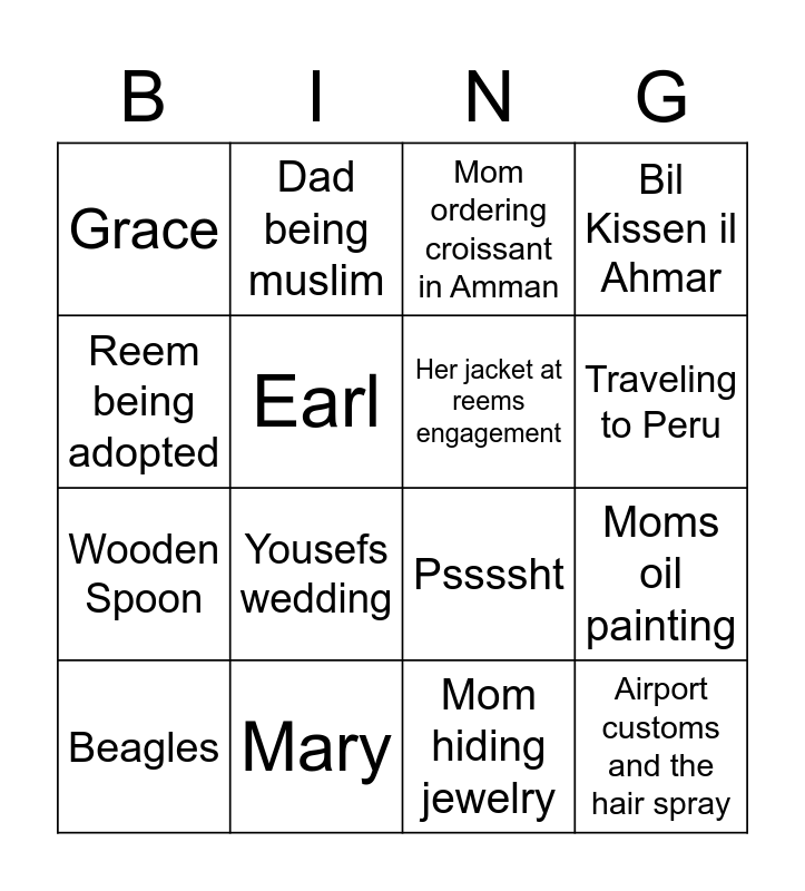 This bingo card has 16 words: Mary, Moms oil painting, Mom ordering croissant in Amman, Grace, Wooden Spoon, Dad being muslim, Pssssht, Mom hiding jewelry, Reem being adopted, Earl, Beagles, Bil Kissen il Ahmar, Yousefs wedding, Traveling to Peru, Her jacket at reems engagement and Airport customs and the hair spray.