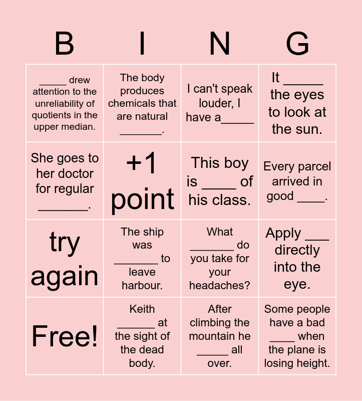 This bingo card has 16 words: Free!, Keith ______ at the sight of the dead body., I can't speak louder, I have a_____, It _____ the eyes to look at the sun., She goes to her doctor for regular _______., The body produces chemicals that are natural _______., What _______ do you take for your headaches?, Apply ___ directly into the eye., _____ drew attention to the unreliability of quotients in the upper median., +1 point, After climbing the mountain he _____ all over., Every parcel arrived in good ____., try again, The ship was _______ to leave harbour., This boy is ____ of his class. and Some people have a bad ____ when the plane is losing height..