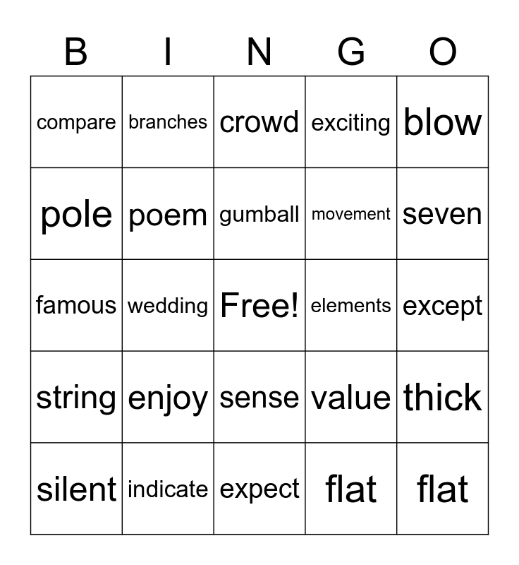 This bingo card has a free space and 29 words: silent, trade, wedding, rather, compare, crowd, poem, enjoy, elements, indicate, except, flat, expect, flat, seven, interesting, sense, string, blow, famous, value, wings, movement, pole, exciting, branches, thick, gumball and blood.
