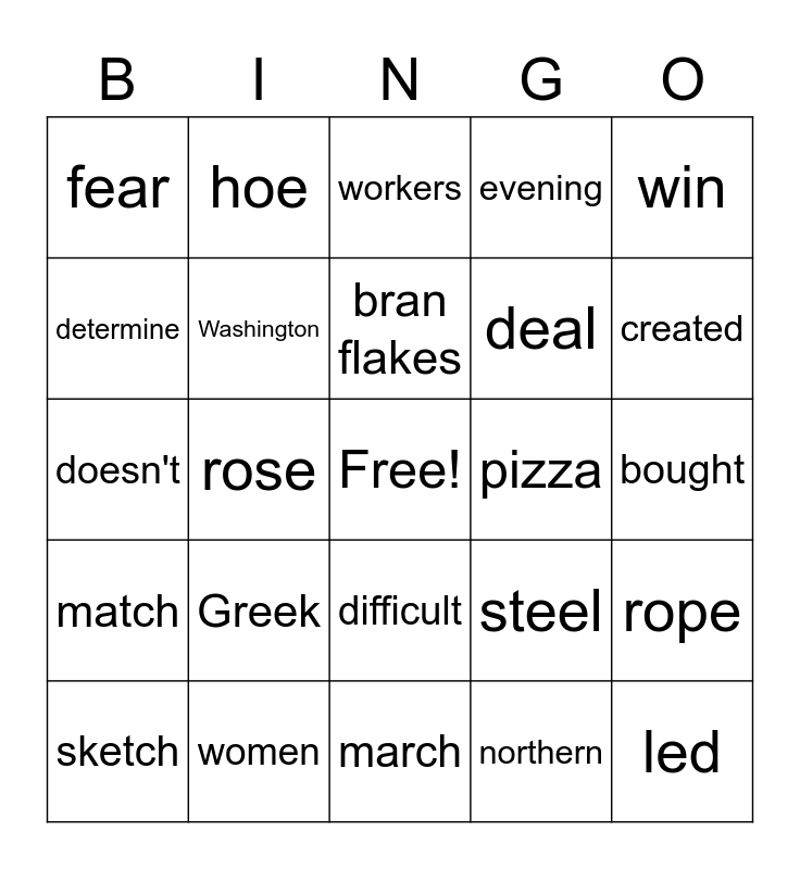 This bingo card has a free space and 29 words: sketch, experience, rose, allow, fear, workers, Washington, Greek, pizza, women, bought, led, march, northern, created, British, difficult, match, win, doesn't, steel, total, deal, determine, evening, hoe, rope, bran flakes and cotton.