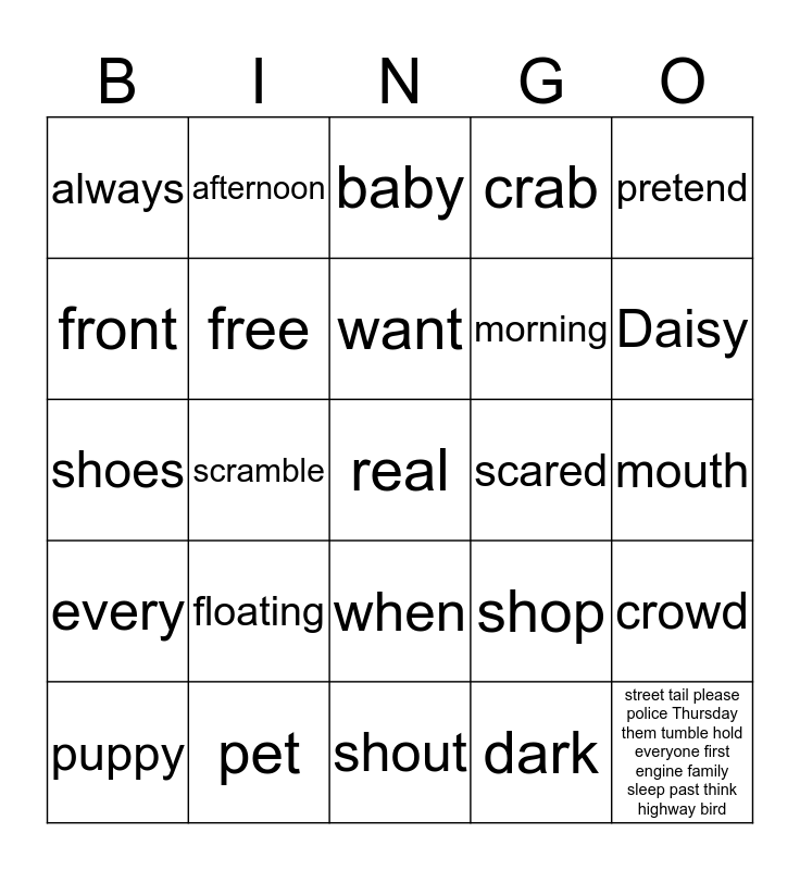 This bingo card has 26 words: when, dark, want, pet, pretend, always, front, afternoon, mouth, shop, morning, shoes, crowd, puppy, scramble, splash, crab, every, baby, real, Daisy, shout, scared, floating, free and street tail please police Thursday them tumble hold everyone first engine family sleep past think highway bird.