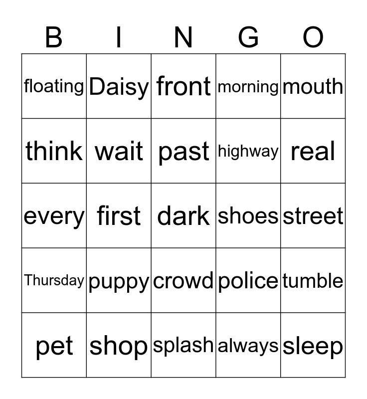 This bingo card has 44 words: when, dark, want, pet, pretend, always, front, afternoon, mouth, shop, morning, shoes, crowd, puppy, scramble, splash, crab, every, baby, real, Daisy, shout, scared, floating, free, street, tail, please, police, Thursday, them, tumble, hold, everyone, first, engine, family, sleep, past, think, highway, bird, wait and tongue.