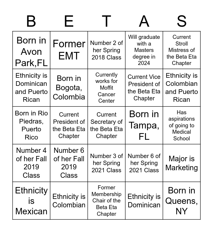 This bingo card has 25 words: Number 6 of her Fall 2019 Class, Former Membership Chair of the Beta Eta Chapter, Currently works for Moffit Cancer Center, Ethnicity is Mexican, Current Stroll Mistress of the Beta Eta Chapter, Born in Avon Park,FL, Ethnicity is Dominican and Puerto Rican, Former EMT, Born in Tampa, FL, Number 3 of her Spring 2021 Class, Current Vice President of the Beta Eta Chapter, Born in Rio Piedras, Puerto Rico, Number 6 of her Spring 2021 Class, Major is Marketing, Born in Bogota, Colombia, Born in Queens, NY, Has aspirations of going to Medical School, Number 2 of her Spring 2018 Class, Ethnicity is Colombian and Puerto Rican, Current President of the Beta Eta Chapter, Current Secretary of the Beta Eta Chapter, Ethnicity is Colombian, Number 4 of her Fall 2019 Class, Will graduate with a Masters degree in 2024 and Ethnicity is Dominican.