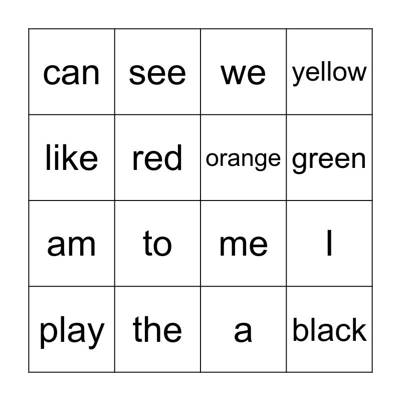 This bingo card has 16 words: the, I, we, can, am, see, me, a, like, red, play, yellow, to, green, orange and black.