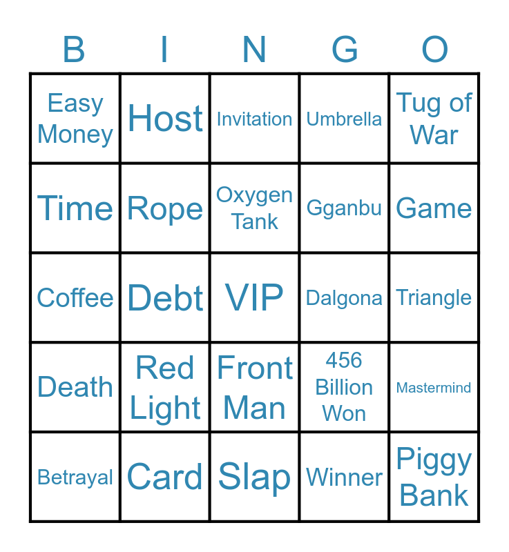 This bingo card has 25 words: Red Light, Slap, Oxygen Tank, Betrayal, Tug of War, Easy Money, Time, Host, Dalgona, Front Man, Gganbu, Coffee, 456 Billion Won, Mastermind, Rope, Piggy Bank, Triangle, Invitation, Game, Debt, VIP, Card, Death, Umbrella and Winner.