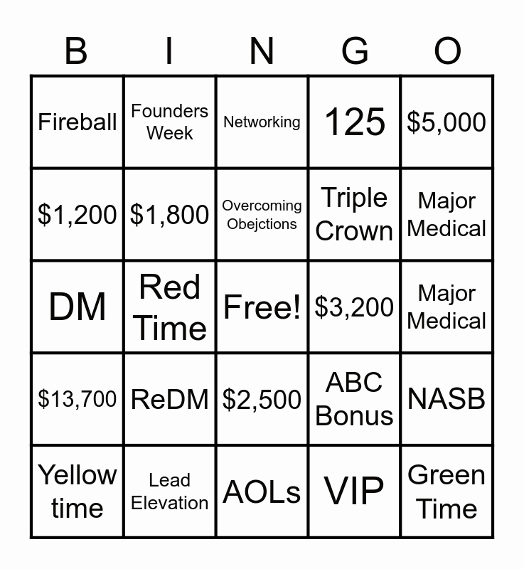 This bingo card has a free space and 34 words: AAOD, SFB, COI, EAP, Major Medical, $1,200, $1,800, AOLs, Triple Crown, Green Time, DM, Founders Week, VIP, IPA, $13,700, Red Time, $2,500, $3,200, NASB, Yellow time, Lead Elevation, Million Dollar Club, 125, Major Medical, Follow up, ReDM, Networking, Open Enrollment, $5,000, Fireball, Referral, Overcoming Obejctions, ABC Bonus and 5%.