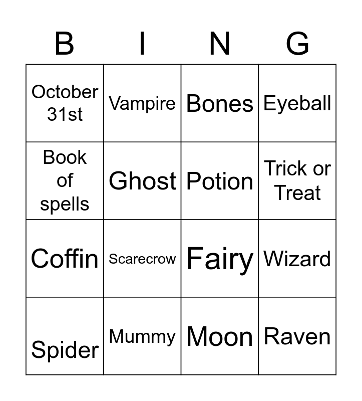 This bingo card has 48 words: Black cat, Spider, Hat, Cauldron, Witch, Broom, Vampire, Jack-O-Lantern, Ghost, Haunted house, Potion, Eyeball, Gravestone, Tombstone, Bat, Cobweb, Trick or Treat, Mummy, Zombie, Book of spells, Wizard, Costume, October 31st, Coffin, Skeleton, Scarecrow, Fransktein, Monster, Werewolf, Raven, Night, Treats, Devil, Candy bag, Skull, Cemetery, Owl, Moon, Darkness, Mask, Fangs, Blood, Bones, Cape, Fairy, Orange, Black and Purple.