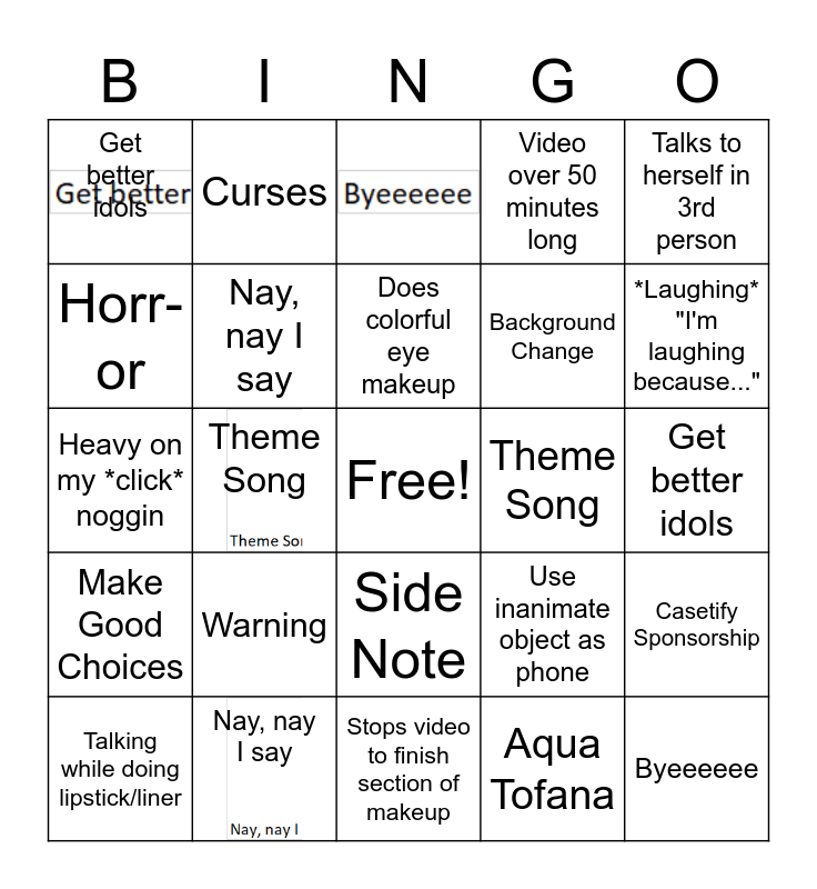 This bingo card has 6 images, a free space and 29 words: Nay, nay I say, Side Note, Theme Song, Stops video to finish section of makeup, Get better idols, Nay, nay I say, Side Note, Theme Song, Stops video to finish section of makeup, Get better idols, Byeeeeee, Aqua Tofana, Suspish, *Laughing* "I'm laughing because...", Mispronouncing a word\, Use inanimate object as phone, Make Good Choices, Warning, Talks to herself in 3rd person, Heavy on my *click* noggin, Hunt-a-Killer Sponsorship, Curses, Background Change, Horr-or, Video over 50 minutes long, Casetify Sponsorship, Talking while doing lipstick/liner, Does colorful eye makeup and Does bold/colorful lip color.