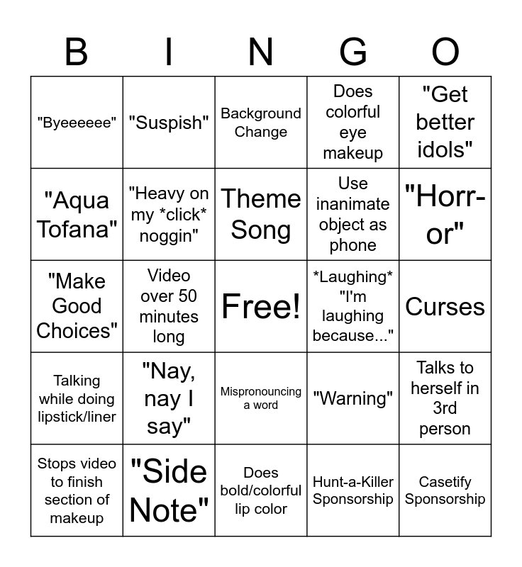 This bingo card has a free space and 24 words: "Nay, nay I say", "Side Note", Theme Song, Stops video to finish section of makeup, "Get better idols", "Byeeeeee", "Aqua Tofana", "Suspish", *Laughing* "I'm laughing because...", Mispronouncing a word, Use inanimate object as phone, "Make Good Choices", "Warning", Talks to herself in 3rd person, "Heavy on my *click* noggin", Hunt-a-Killer Sponsorship, Curses, Background Change, "Horr-or", Video over 50 minutes long, Casetify Sponsorship, Talking while doing lipstick/liner, Does colorful eye makeup and Does bold/colorful lip color.