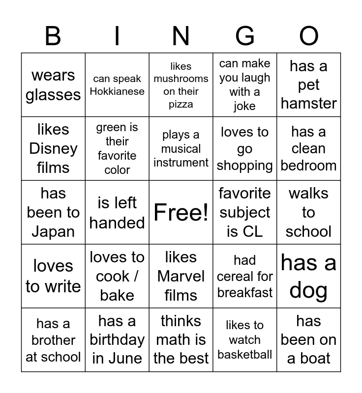 This bingo card has a free space and 24 words: loves to cook / bake, has a birthday in June, plays a musical instrument, has a brother at school, has a pet hamster, wears glasses, likes Disney films, can speak Hokkianese, favorite subject is CL, likes Marvel films, loves to go shopping, has been to Japan, had cereal for breakfast, has a dog, green is their favorite color, likes to watch basketball, walks to school, likes mushrooms on their pizza, has a clean bedroom, is left handed, has been on a boat, loves to write, can make you laugh with a joke and thinks math is the best.