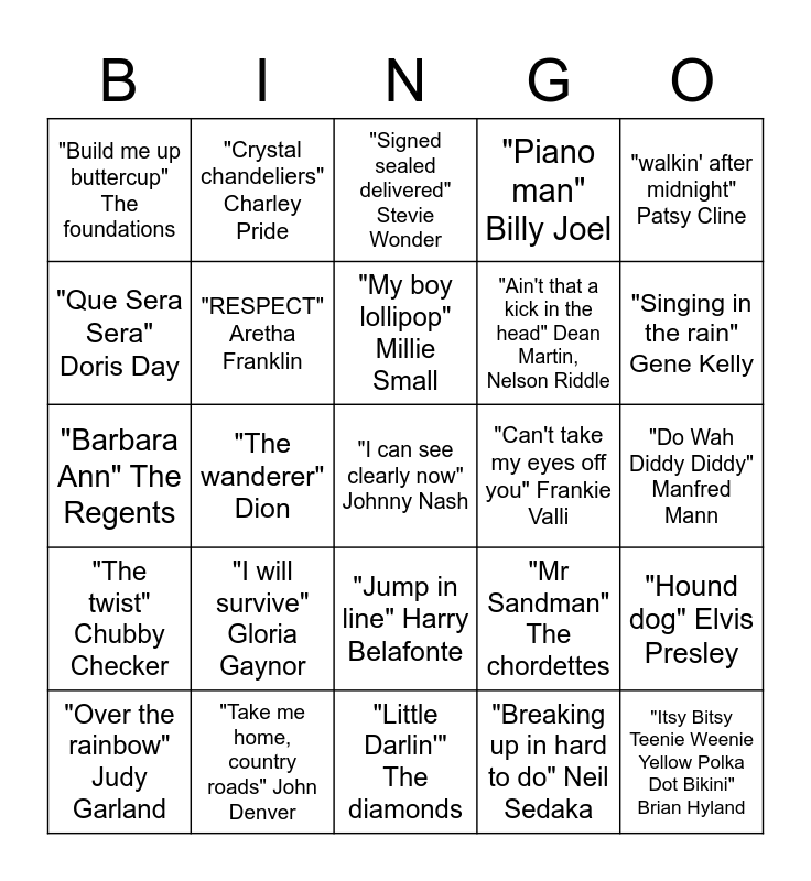 This bingo card has 46 words: Free!, "I can see clearly now" Johnny Nash, "That'll ne the day" Buddy Holly, "Little Darlin'" The diamonds, "I will survive" Gloria Gaynor, "What a wonderful world" Louis Armstrong, "Crystal chandeliers" Charley Pride, "Saturday night at the movies" The drifters, "Que Sera Sera" Doris Day, "At the hop" Danny and the Juniors, "RESPECT" Aretha Franklin, "Piano man" Billy Joel, "Hound dog" Elvis Presley, "Mr Sandman" The chordettes, "My girl" The Temptations, "Boogie Woogie Bugle Boy" The Andrew sisters, "My boy lollipop" Millie Small, "Can't take my eyes off you" Frankie Valli, "Jailhouse Rock" Jerry Lee Lewis, "walkin' after midnight" Patsy Cline, "The wanderer" Dion, "Breaking up in hard to do" Neil Sedaka, "Build me up buttercup" The foundations, "Ain't that a kick in the head" Dean Martin, Nelson Riddle, "Rockin' Robin" Bobby Day, "Singing in the rain" Gene Kelly, "Over the rainbow" Judy Garland, "Under the boardwalk" the Drifters, "Jump in line" Harry Belafonte, "The twist" Chubby Checker, "Unforgettable" Nat King Cole, "I walk the line" Johnny Cash, "Sugar Sugar" gthe Archies, "Rags to Riches" Tony Bennett, "Sweet Caroline" Neil Diamond, "Take me home, country roads" John Denver, "Do Wah Diddy Diddy" Manfred Mann, "Splish splash" Bobby Darin, "All shook up" Elvis Presley, "Please Mr Postman" The Marvelettes, "Itsy Bitsy Teenie Weenie Yellow Polka Dot Bikini" Brian Hyland, "Signed sealed delivered" Stevie Wonder, "Barbara Ann" The Regents, "Moon River" Aubrey Hepburn, "Candle in the wind" Elton John and "Cheek to cheek" Frank Sinatra.
