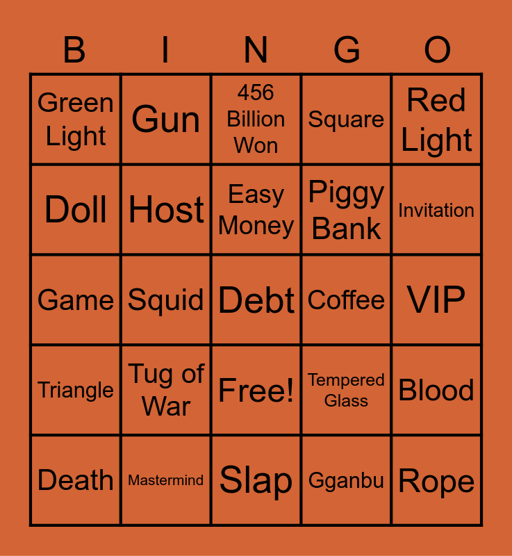 This bingo card has 26 words: Free!, Gganbu, Easy Money, Mastermind, Red Light, Green Light, Doll, Gun, VIP, Tempered Glass, Piggy Bank, Game, Blood, Death, Squid, Circle, Square, Triangle, 456 Billion Won, Debt, Invitation, Slap, Coffee, Tug of War, Host and Rope.