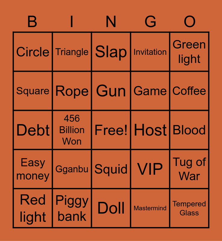 This bingo card has a free space and 25 words: Gganbu, Doll, Gun, Red light, Green light, Circle, Square, Triangle, Host, Squid, Game, Debt, VIP, Tug of War, Rope, Death, Blood, Slap, Coffee, 456 Billion Won, Tempered Glass, Piggy bank, Easy money, Invitation and Mastermind.